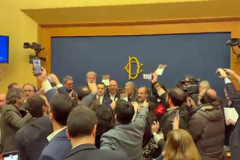 Una protesta pacifica di deputati delle opposizioni ha impedito che si svolgesse questa conferenza stampa e noi saremo sempre delle sentinelle attente a salvaguardare i valori democratici della nostra Repubblica, fondata sull'antifascismo e a osteggiare con i mezzi pacifici chi invece ci vuole riportare a un drammatico passato.